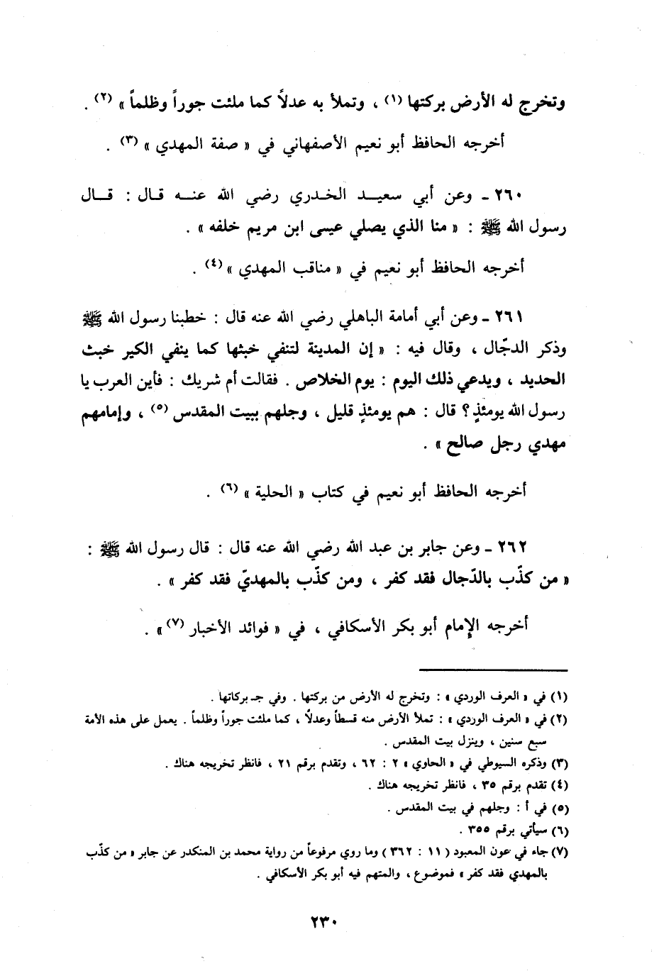 وعن جابر بن عبد الله رضي الله عنه قال: قال رسول الله صلى الله عليه وسلم: " من كذب بالدجال فقد كفر، ومن كذب بالمهدي فقد كفر ".