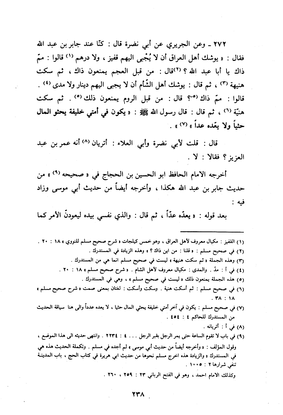 وعن الجريري، عن أبي نضرة، قال: كنا عند جابر بن عبد الله، فقال: يوشك أهل العراق أن يجبى إليهم درهم ولا قفيز.