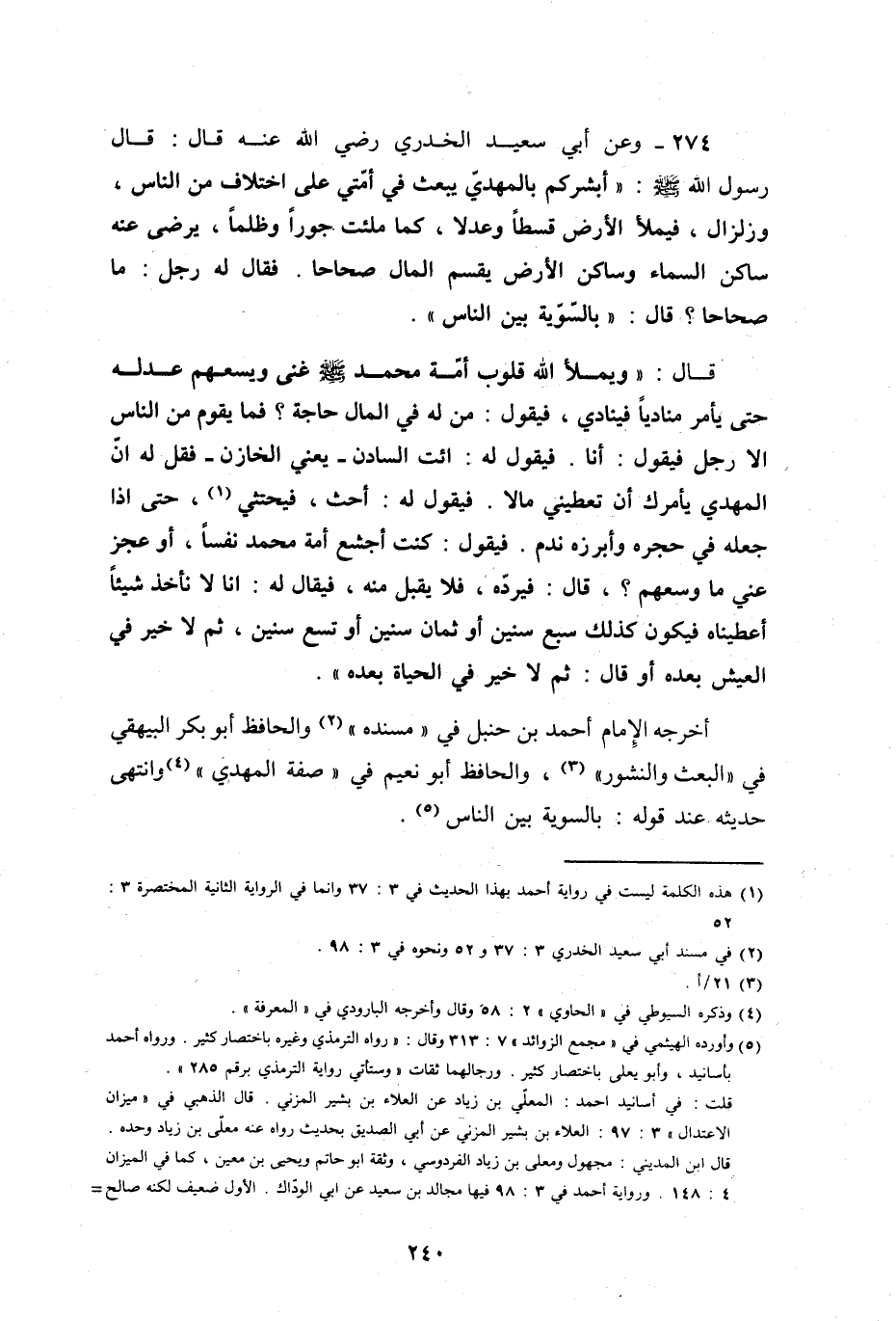 ورواه الحافظ أبو نعيم الأصبهاني، في صفة المهدي، وانتهى حديثه عند قوله: بالسوية بين الناس.