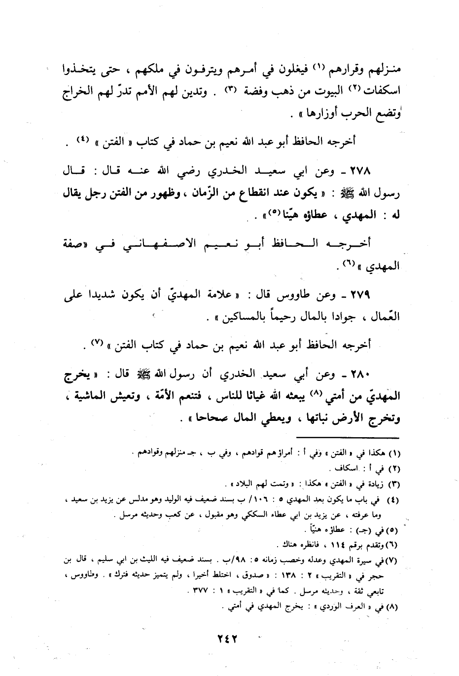 وعن أبي سعيد الخدري، رضي الله عنه قال: قال رسول الله صلى الله عليه وسلم: " يكون عند انقطاع الزمان، وظهور من الفتن، رجل يقال له: المهدي. عطاؤه هنيئاً ".