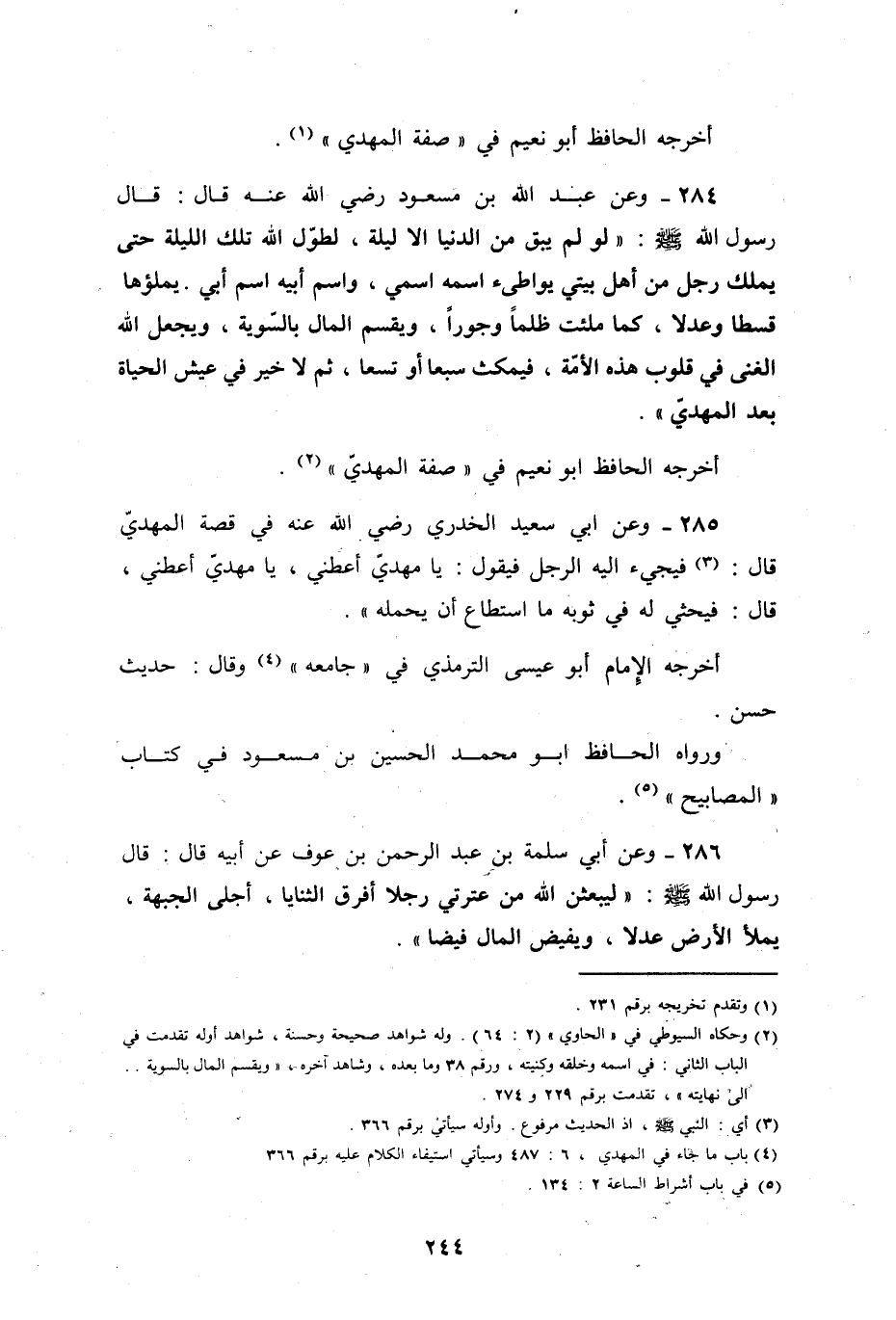 وعن عبد الله بن مسعود رضي الله عنه قال: قال رسول الله صلى الله عليه وسلم: " لو لم يبق من الدنيا إلا ليلة، لطول الله تلك الليلة حتى يملك رجل من أهل بيتي، يواطئ اسمه اسمي، واسم أبيه اسم أبي، يملأها قسطاً وعدلاً، كما ملئت ظلماً وجوراً، ويقسم المال بالسوية، ويجعل الله الغنى في قلوب هذه الأمة فيمكث سبعاً، أو تسعاً ثم لا خير في عيش الحياة بعد المهدي ".