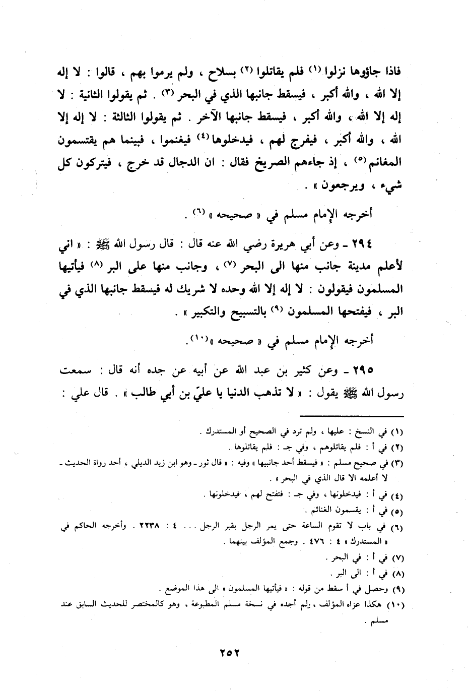 فإذا جاؤوها نزلوا عليها فلم يقاتلوا بسلاح، ولم يرموا بسهم، قالوا: لا إله إلا الله، والله أكبر، فيسقط جانبها الذي في البحر، ثم يقولون الثانية: لا إله إلا الله، والله أكبر. فيسقط جانبها الآخر، ثم يقولون الثالثة: لا إله إلا الله، والله أكبر، فيفرج لهم فيدخلوها، فيغنمون، فبينما هم يقتسمون المغانم إذ جاءهم الصريخ، فقال: إن الدجال قد خرج، فيتركون كل شيء ويرجعون.
