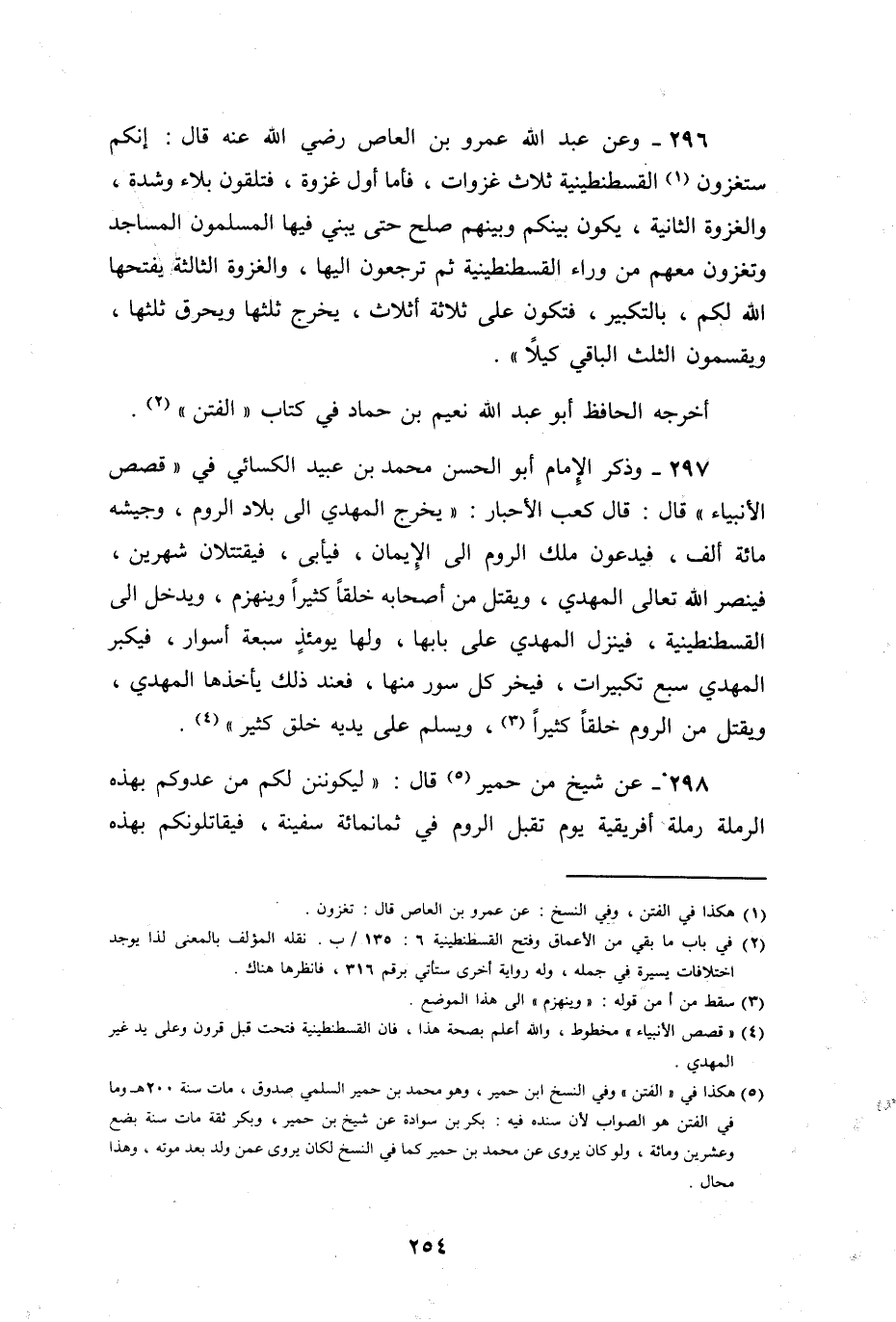 وعن عمرو بن العاص، قال: " تغزون القسطنطينية ثلاث غزوات، فأما غزوة فتكون بلاء وشدة، والغزوة الثانية يكون بينكم وبينهم صلح حتى يبني فيها المسلمون المساجد وتغزون معهم من وراء القسطنطينية، ثم ترجعون إليها، والغزوة الثالثة يفتحها الله لكم بالتكبير، فتكون على ثلاثة أثلاث، يخرب ثلثها، ويخرق ثلثها، يقسمون الثلث الباقي كيلا ".