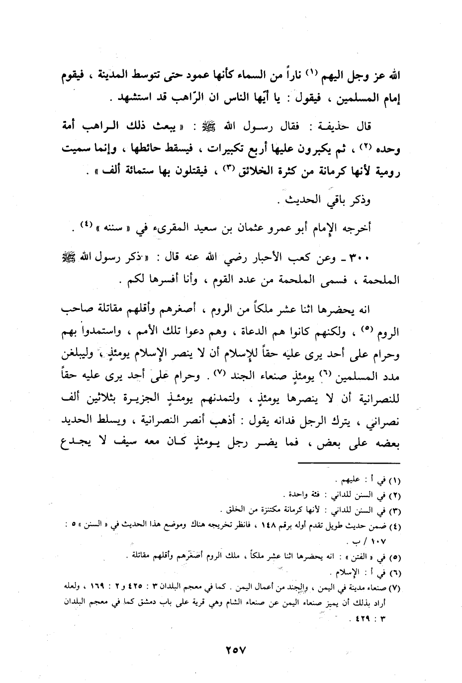 وعن كعب الأحبار رضي الله عنه قال: ذكر رسول الله صلى الله عليه وسلم الملحمة، فسمى الملحمة من عدد القوم، وأنا أفسرها لكم: إنه يحضرها اثنا عشر ملكاً من الروم، أصغرهم وأقلهم مقاتلة صاحب الروم، ولكنهم كانوا هم الدعاة، وهم دعوا تلك الأمم، واستمدوا بهم، وحرام على أحد يرى عليه حقاً للإسلام أن لا ينصر الإسلام يومئذ، وليبلغن مدد المسلمين يومئذ صنعاء الجند، وحرام على أحد يرى عليه حقاً للنصرانية أن لا ينصرها يومئذ، ولتمدنهم يومئذ الجزيرة بثلاثين ألف نصراني، يترك الرجل فدائه، يقول: أذهب أنصر النصرانية، ويسلط الحديد بعضه على بعض، فما يضر رجلاً يومئذٍ كان معه سيف لا يجدع