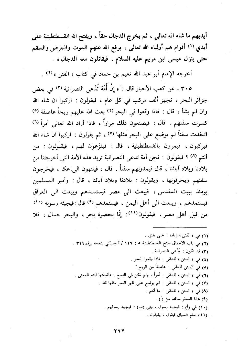 قال: فيفزعون لم، فيقولون: ما أنتم؟ فيقولون: نحن أمة تدعى النصرانية، نريد هذه الأمة التي أخرجتنا من بلادنا وبلاد آبائنا. فيمدونهم سفناً.