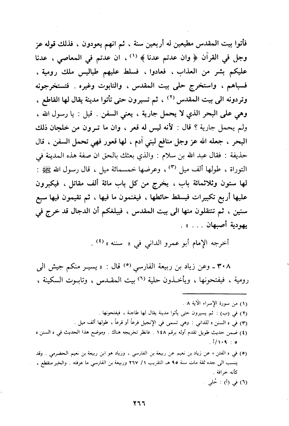 مطيهين له أربعين سنة، ثم يعودون، فذلك قوله عز وجل في القرآن: " وإن عدتم عدنا " إن عذتم في المعاصي عدنا عليكم بشر من العذاب، فعادوا، فسلط عليهم طياليس ملك رومية، فسباهم، واستخرج حلي بيت المقدس والتابوت وغيره، فيستخرجونه ويردونه إلى بيت المقدس، ثم يسيرون حتى يأتوا مدينة يقال لها طاجنة، فيفتحونها، ثم يسيرون حتى يأتوا مدينة يقال لها القاطع، وهي على البحر الذي لا يحمل جارية - يعني السفن - فيه ".