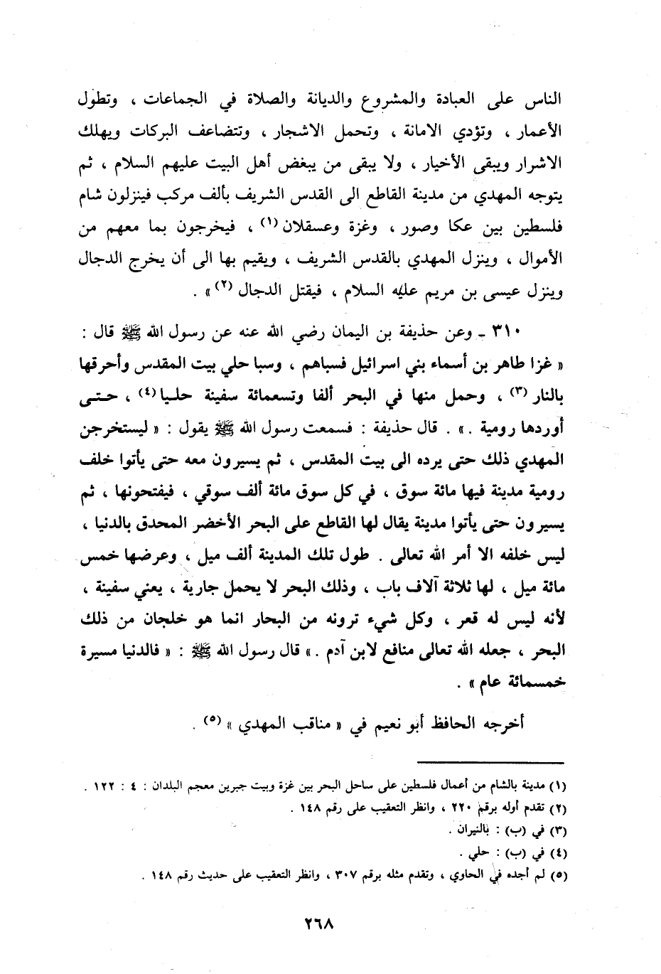 ثم يتوجه المهدي من مدينة القاطع إلى القدس الشريف، بألف مركب، فينزلون شام فلسطين بين عكا وصور وغزة وعسقلان، فيخرجون ما معهم من الأموال، وينزل المهدي بالقدس الشريف، ويقيم بها إلى أن يخرج الدجال، وينزل عيسى ابن مريم عليه السلام فيقتل الدجال.