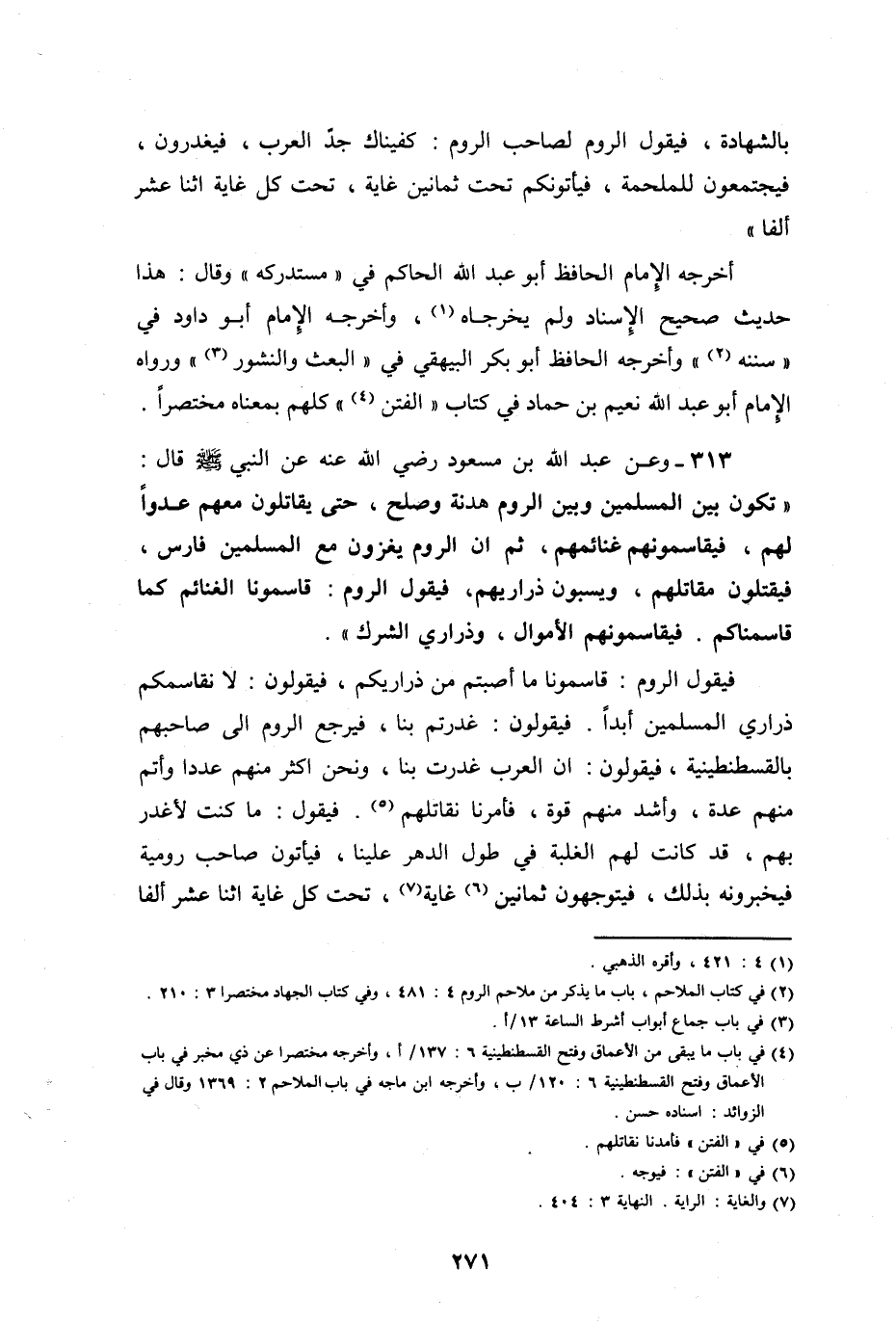 وعن عبد الله بن مسعود، رضي الله عنه عن النبي صلى الله عليه وسلم قال: " تكون بين الروم وبين المسلمين هدنة وصلح، حتى يقاتلوا معهم عدواً لهم، فيقاسمونهم غنائمهم.