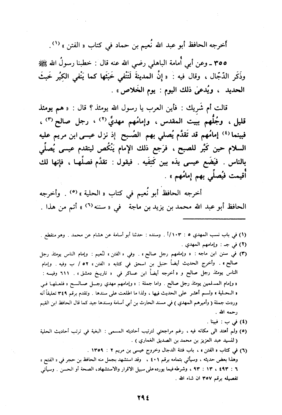 قالت أم شرك: فأين العرب يا رسول الله يومئذ؟ قال: " هم يومئذ قليل، وجلهم ببيت المقدس، وإمامهم مهدي رجل صالح، فبينما إمامهم قد تقدم يصلي بهم الصبح، إذ نزل عيسى ابن مريم، حين كبر للصبح فرجع ذلك الإمام ينكص. ليتقدم عيسى يصلي بالناس، فيضع عيسى يده بين كتفيه فيقول: تقدم فصلها، فإنها لك أقيمت. فيصلي بهم إمامهم ".