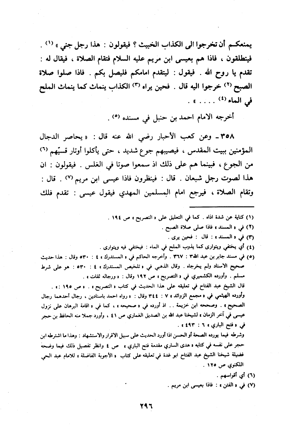 وعن كعب الأحبار، رضي الله عنه قال: يحاصر الدجال المؤمنين ببيت المقدس، فيصبهم جوع شديد، حتى يأكلوا أوتار قسيهم من الجوع، فبينما هم على ذلك، إذ سمعوا صوتاً في الغلس. فيقولون: إن هذا لصوت رجل شبعان.