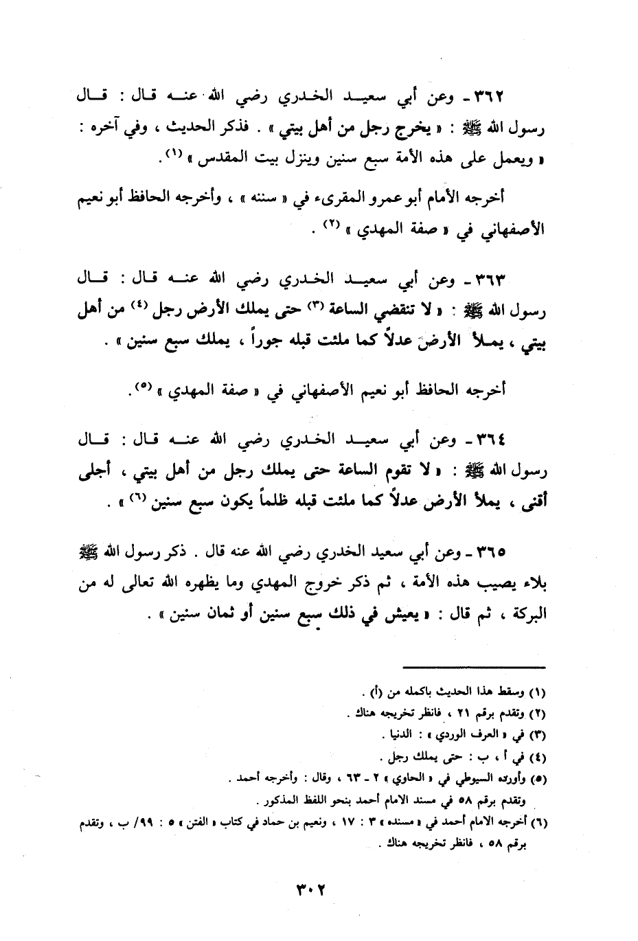 وعن أبي سعيد الخدري رضي الله عنه قال: قال رسول الله صلى الله عليه وسلم: " لا تنقضي الساعة حتى يملك الأرض رجل من أهل بيتي، يملأ الأرض عدلاً، كما ملئت قبله جوراً، يملك سبع سنين ".
