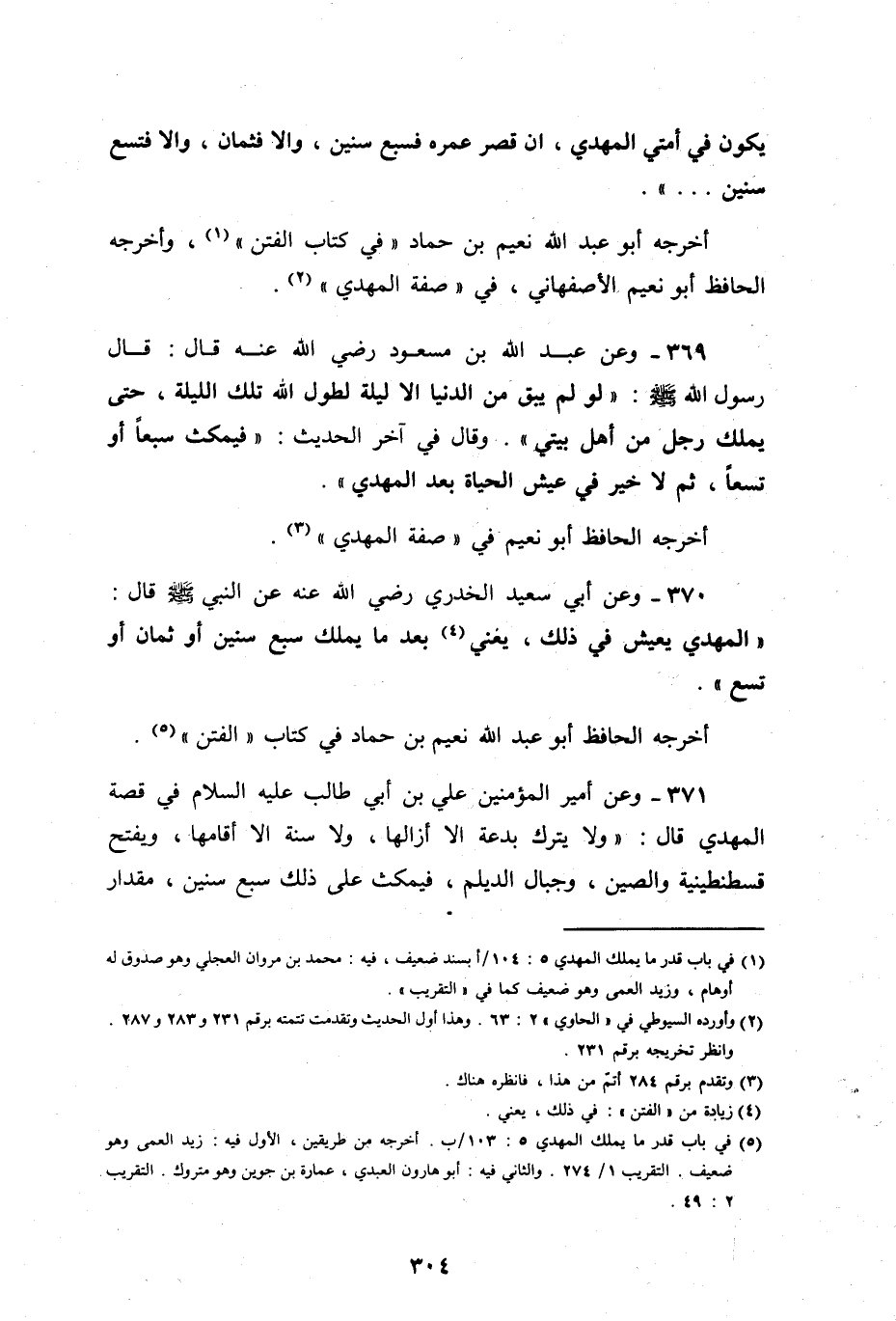 وعن أبي سعيد الخدري، رضي الله عنه عن النبي صلى الله عليه وسلم، قال: " المهدي يعيش بعد ما يملك سبع سنين. أو ثمان، أو تسع ".
