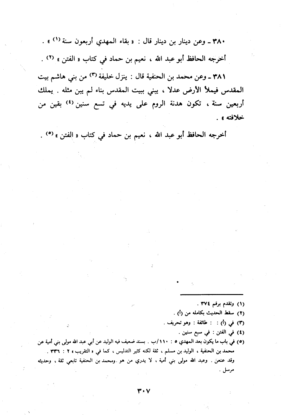 وعن محمد بن الحنفية، قال: ينزل خليفة من بني هاشم بيت المقدس، فيملأ الأرض عدلاً، يبني بيت المقدس بناء لم يبن مثله، يملك أربعين سنة، تكون هدنة الروم على يديه، في تسع سنين بقين من خلافته.