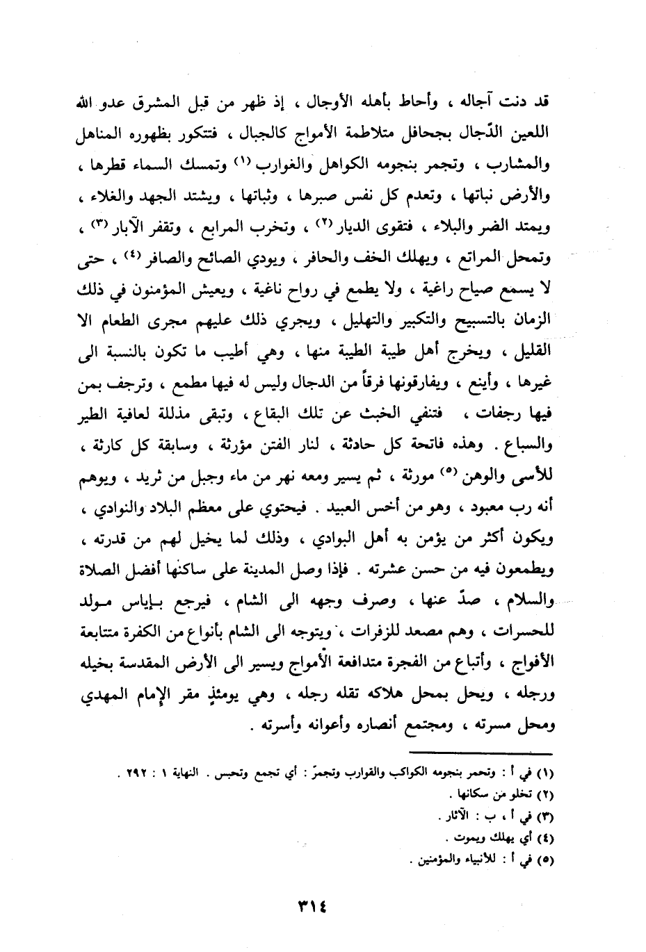قد دنت آجاله وأحاط بأهله الأوجال، إذ ظهر من قبل المشرق عدو الله اللعين الدجال، بجحافل متلاطمة الأمواج كالجبال، فتكدر بظهوره المناهل والمشارب، وينجم بنجومه الكواهل والغوارب، وتمسك السماء قطرها، والأرض نباتها، وتعدم كل نفس صبرها وثباتها، ويشتد الجهد والغلاء، ويمتد الضر والبلاء، فتقوي الديار، وتخرب المرابع، وتقفر الآثار، وتمحل المراتع، ويهلك الخف والحافر، ويودي الصائح والظافر، حتى لا يسمع صياح راغية، ولا يطمع في رواح ثاغية، ويعيش المؤمنون في ذلك الزمان بالتسبيح والتكبير والتهليل، ويجري ذلك عليهم مجرى الطعام إلا القليل، وتخرج أهل طيبة منها وهي أطيب ما تكون بالنسبة إلى غيرها وأينع، ويفارقونها فرقاً من الدجال وليس له فيها مطمع، وترجف بمن فيها رجفات فتنفي الخبث عن تلك البقاع، وتبقى مذللة لعافية الطير والسباع، وهذه فاتحة كل حادثة لنار الفتن مؤرثة، وسابقة كل كارثة للأسى والوهن مورثة.
