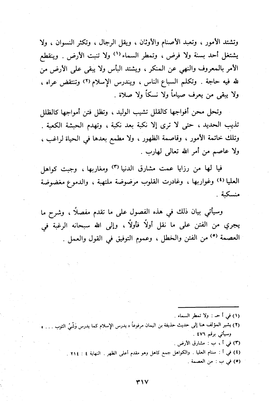 وسيأتي بيان ذلك في هذه الفصول على ما تقدم مفصلاً، وشرح ما يجري من الفتن على ما نقل أولاً فأولاً، وإلى الله تعالى الرغبة من العصمة من الفتن والخطل، وعموم التوفيق في القول والعمل.