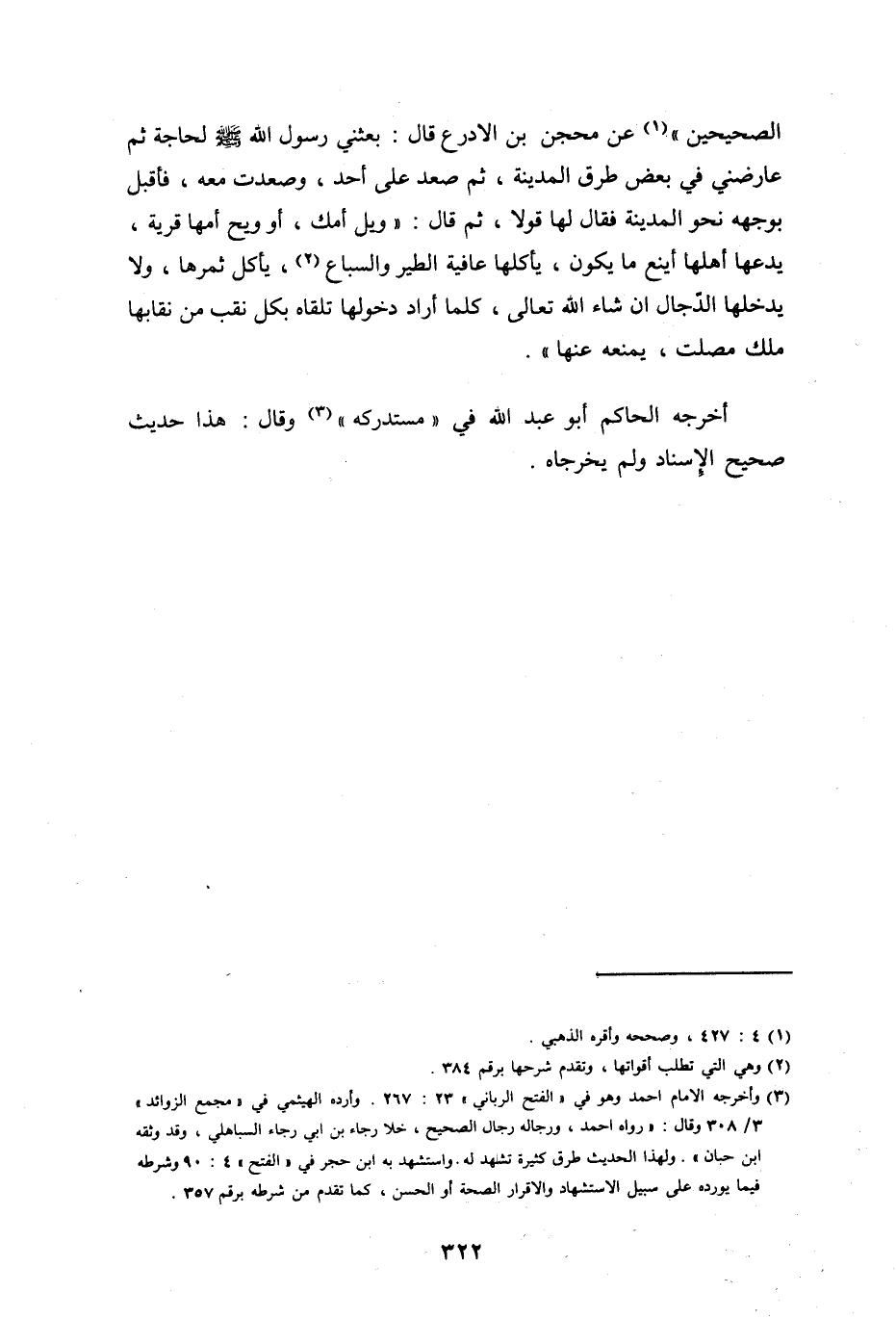 الصحيح عن محجن بن الأدرع، قال: بعثني رسول الله صلى الله عليه وسلم، لحاجة، ثم عارضني في بعض طرق المدينة، ثم صعد على أحد وصعدت معه، فأقبل بوجهه نحو المدينة، فقال لها قولاً، ثم قال: ويل أمك أو " ويح أمها قرية يدعها أهلها أينع ما تكون، تأكلها عافية الطير والسباع، تأكل ثمرها، ولا يدخلها الدجال إن شاء الله تعالى، كلما أراد دخولها يلقاه بكل نقب من نقابها ملك مصلت يمنعه عنها ".