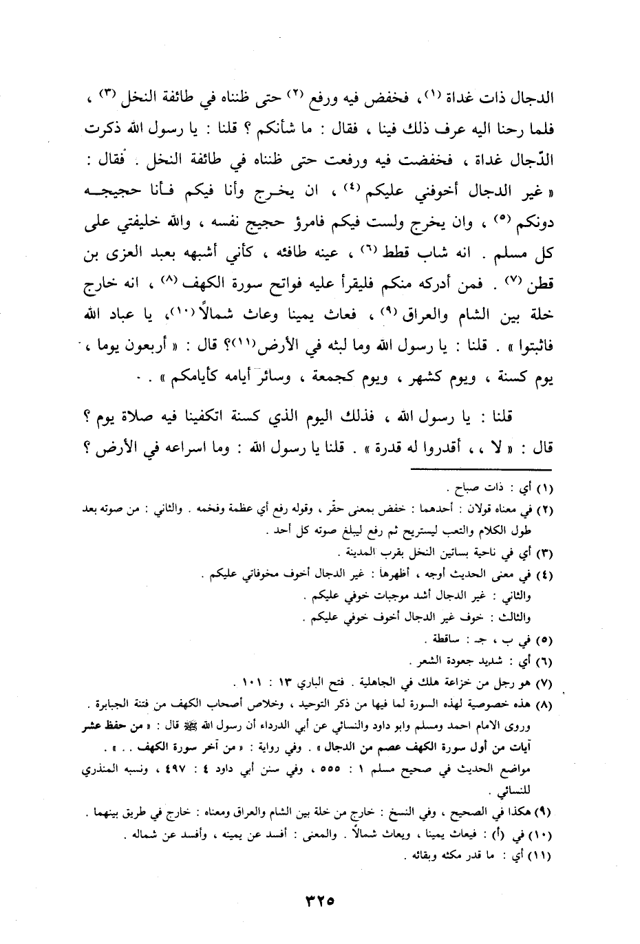 الدجال ذات غداة، فخفض فيه ورفع، حتى ظنناه في طائفة النخل، فلما رحنا إليه عرف ذلك فينا، فقال: ما شأنكم؟ قلنا: يا رسول الله ذكرت الدجال غداة، فخفضت ورفعت، حتى ظنناه في طائفة النخل.......