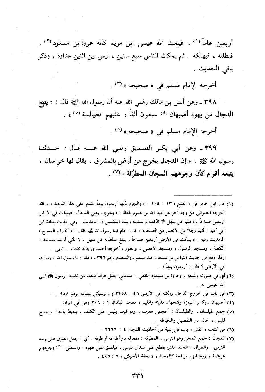 وعن أنس بن مالك رضي الله عنه أن رسول الله صلى الله عليه وسلم قال: " يتبع الدجال من يهود أصبهان سبعون ألفاً عليهم الطيالسة ".