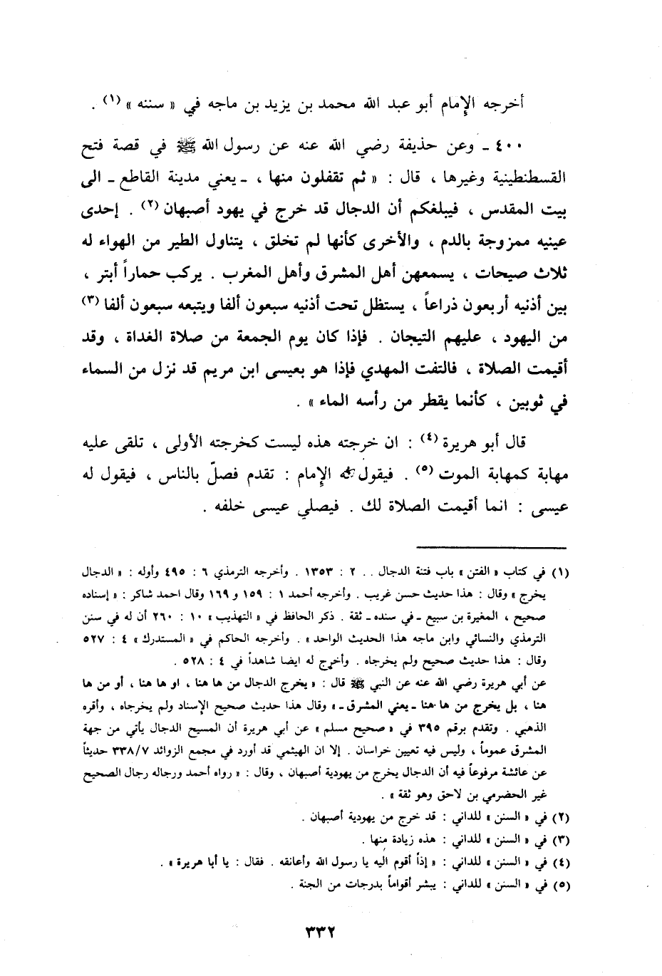 وعن حذيفة رضي الله عنه عن رسول الله صلى الله عليه وسلم في قصة فتح القسطنطينية وغيرها: " ثم تقفلون منها - يعني مدينة القاطع - إلى بيت المقدس، فيبلغكم أن الدجال قد خرج في يهود أصبهان، إحدى عينيه ممزوجة بالدم، والأخرى كأنها لم تخلق، يتناول الطير من الهواء، له ثلاث صيحات، يسمعهن أهل المشرق وأهل المغرب، يركب حماراً أبتر، بين أذنيه أربعون ذراعاً، يستظل تحت أذنيه سبعون ألفاً من اليهود عليهم التيجان، فإذا كان يوم الجمعة من صلاة الغداة، وقد أقيمت الصلاة، فالتفت المهدي، فإذا هو بعيسى ابن مريم، قد نزل من السماء في ثوبين، كأنما يقطر من رأسه الماء " - فقال أبو هريرة: إن خرجته هذه ليست كخرجته الأولى، تلقى عليه مهابة كمهابة الموت - " فيقول له الإمام: تقدم فصل بالناس، فيقول له عيسى: إنما أقيمت الصلاة لك، فيصلي عيسى خلفه ".