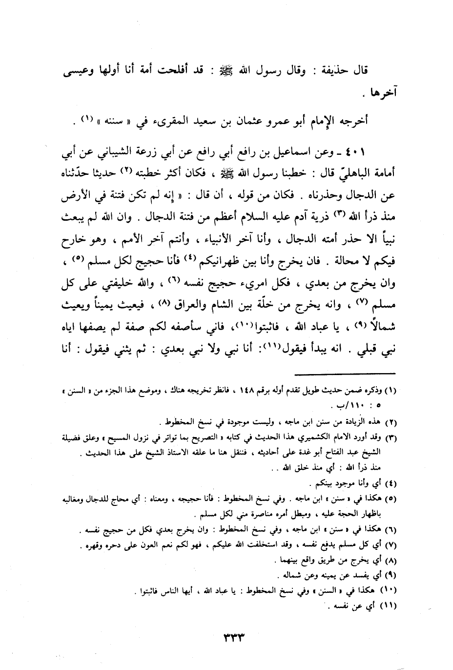 قال حذيفة: وقال رسول الله صلى الله عليه وسلم: " قد أفلحت أمة أنا أولها، وعيسى آخرها ".
