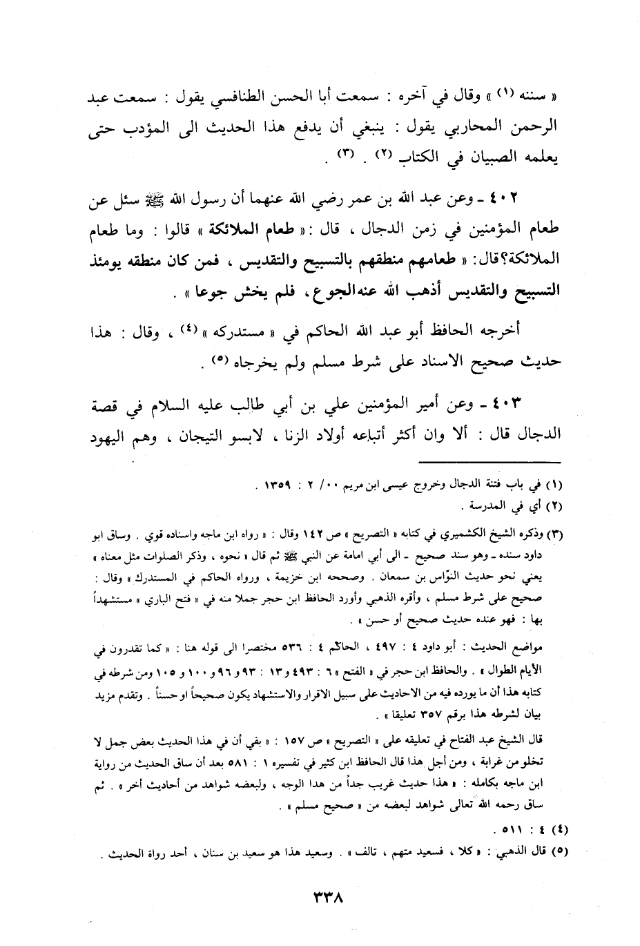 وعن عبد الله بن عمر رضي الله عنهما أن رسول الله صلى الله عليه وسلم، سئل عن طعام المؤمنين في زمن الدجال، قال: " طعام الملائكة ".