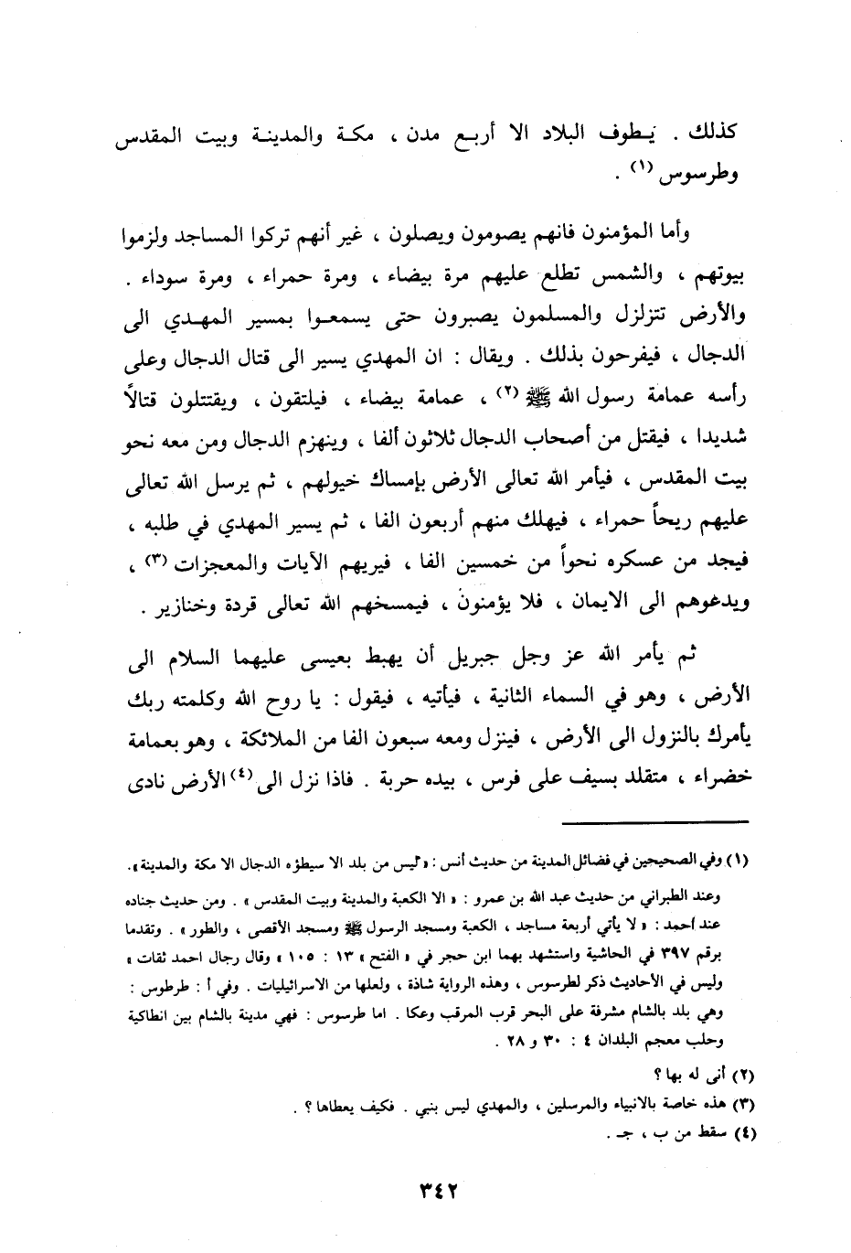 وأما المؤمنون فإنهم يصومون ويصلون، غير أنهم تركوا المساجد ولزموا بيوتهم. والشمس تطلع عليهم مرة بيضاء ومرة حمراء، ومرة سوداء، والأرض تزلزل، والمسلمون يصبرون، حتى يسمعوا بمسير المهدي إلى الدجال فيفرحون بذلك.......