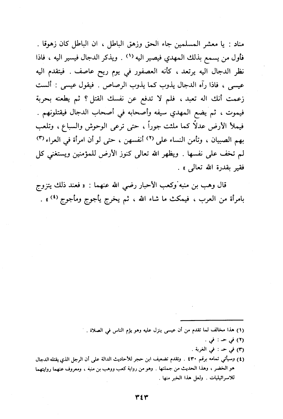 منادٍ: يا معشر المسلمين، جاء الحق وزهق الباطل. فأول من يسمع بذلك المهدي فيصير إليه ويذكر الدجال، فيسير إليه فإذا نظر الدجال إليه يرتعد كأنه العصفور في يوم ريح عاصف، فيتقدم إليه عيسى، فإذا رآه الدجال يذوب، كما يذوب الرصاص، فيقول عيسى: ألست زعمت أنك إلهٌ تعبد، فلم لا تدفع عن نفسك القتل؟ ثم يطعنه بحربة، فيموت.
