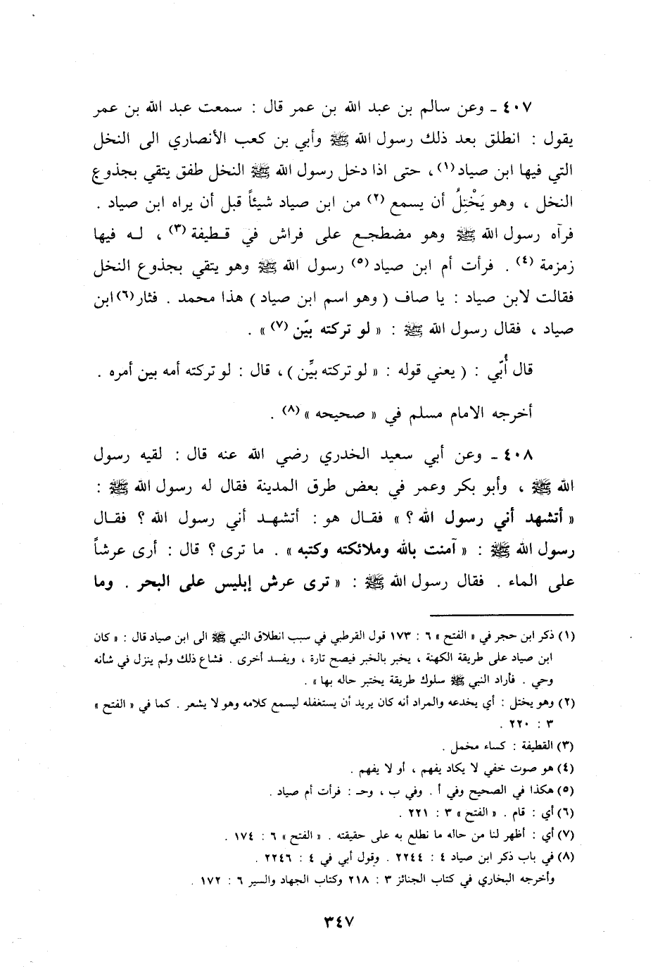 وعن سالم بن عبد الله بن عمر، رضي الله عنهم، قال: سمعت عبد الله بن عمر، يقول: انطلق بعد ذلك رسول الله صلى الله عليه وسلم وأبي بن كعب، إلى النخل التي فيها ابن صياد، حتى إذا دخل رسول الله صلى الله عليه وسلم إلى النخل، طفق يتقي بجذوع النخل، وهو يختل أن يسمع من ابن صياد شيئاً، قبل أن يراه ابن صياد فرآه رسول الله صلى الله عليه وسلم، وهو مضطجع على فراش في قطيفة، له فيها زمزمة، فرأت أم ابن صياد رسول الله صلى الله عليه وسلم، وهو يتقي بجذوع النخل، فقالت لابن صياد: يا صاف - هو اسم ابن صياد - هذا محمد.