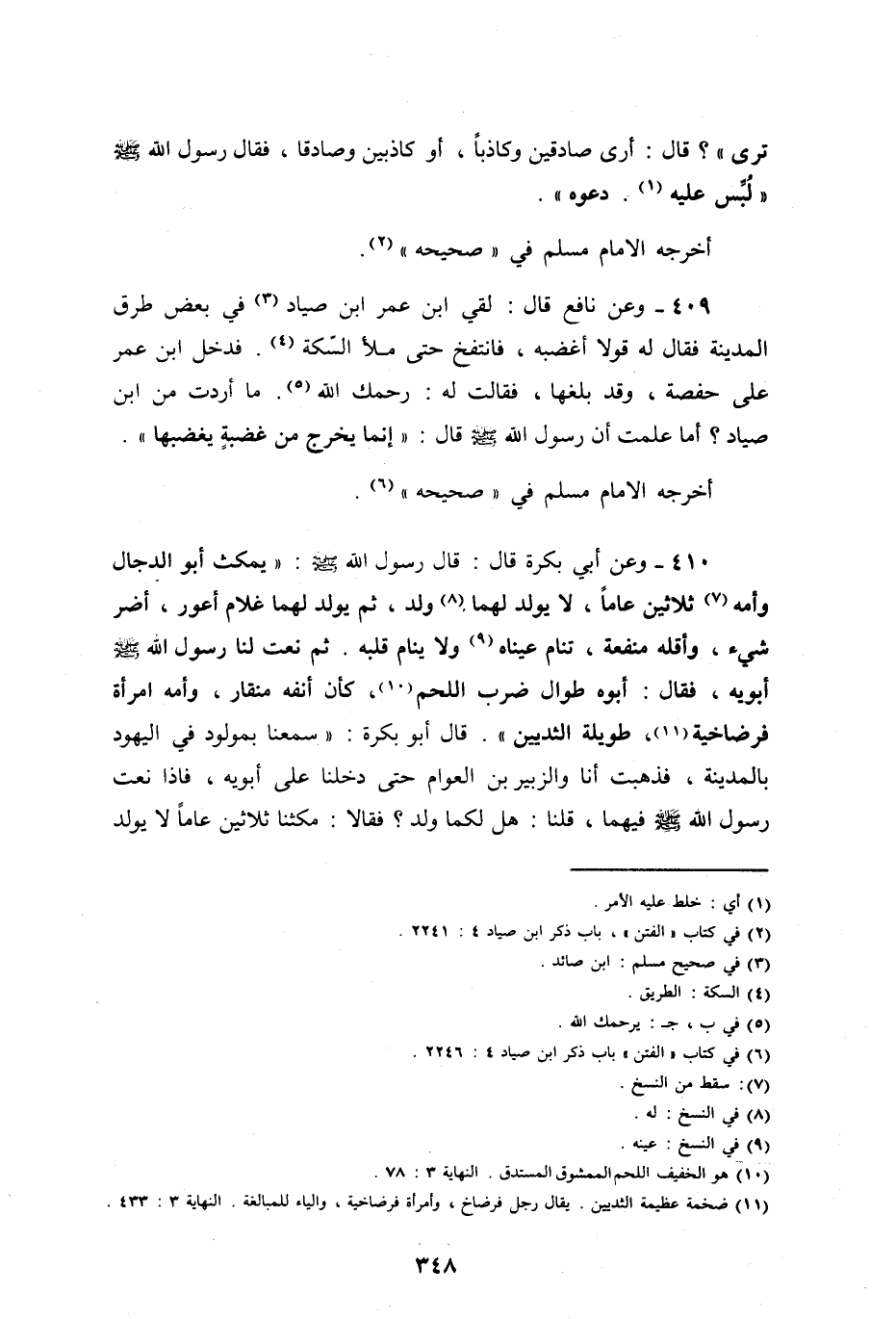أخرجه الإمام مسلم، في صحيحه وعن نافع، قال: لقي ابن عمر ابن صياد، في بعض طرق المدينة، فقال له قولاً أغضبه، فانتفخ حتى ملأ السكة، فدخل ابن عمر على حفصة، وقد بلغها، فقالت له: رحمك الله، ما أردت من ابن صياد؟ أما علمت أن رسول الله صلى الله عليه وسلم قال: " إنما يخرج الدجال من غضبة يغضبها ".
