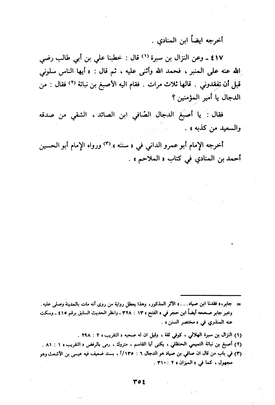 وعن النزال بن سبرة، قال: خطبنا علي بن أبي طالب، عليه السلام، على المنبر، ثم قال: أيها الناس، سلوني قبل أن تفقدوني، قالها ثلاث مرات، فقام إليه الأصبغ بن نباتة فقال: من الدجال، يا أمير المؤمنين؟ قال: يا أصبغ، الدجال الصافي ابن الصياد، الشقي من صدقه، والسعيد من كذبه.