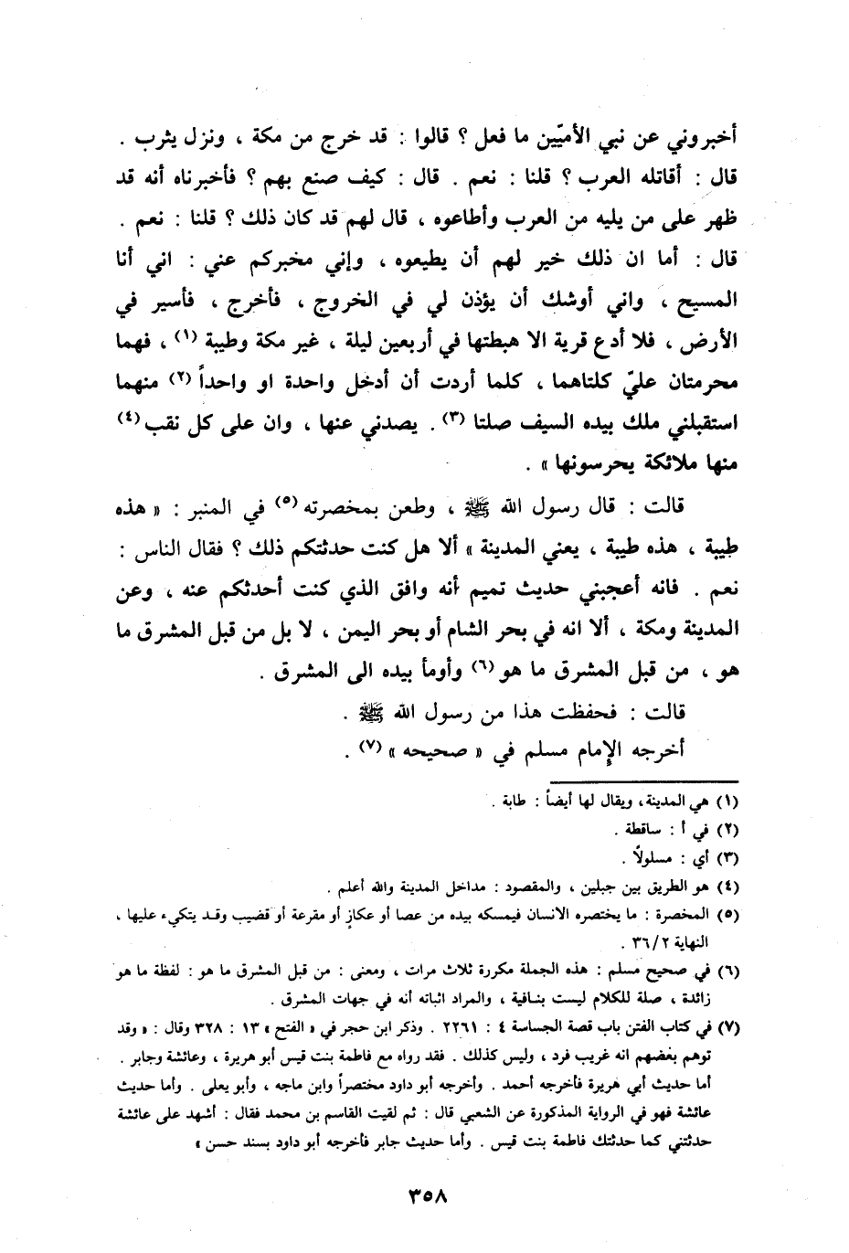 قال: أما إن ذلك خير لهم أن يطيعوه، وإني مخبركم عني، أنا المسيح، وإني أوشك أن يؤذن لي في الخروج، فأخرج فأسير في الأرض، فلا أدع قرية إلا هبطتها في أربعين ليلة، غير مكة وطيبة، هما محلامتان على كلتاهما، كلما أردت أن أدخل واحدة أو واحداً منهما، استقبلني ملك بيده السيف صلتاً يصدني عنها، وإن على كل نقب منها ملائكة يحرسونها ".