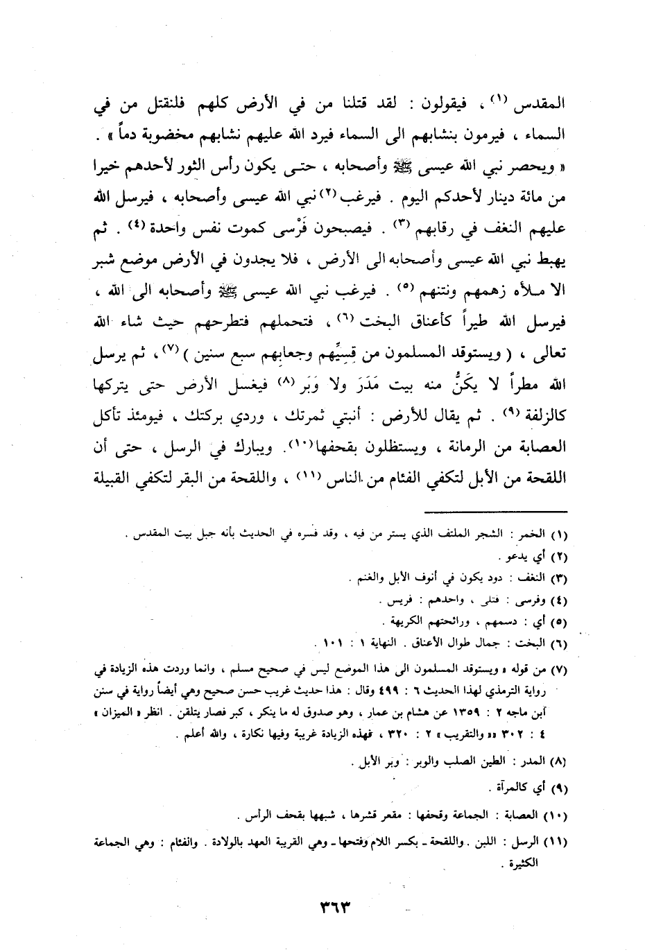 ويحصر نبي الله عيسى صلى الله عليه وسلم وأصحابه حتى يكون رأس الثور لأحدهم خير من مائة دينار لأحدكم اليوم، فيرغب نبي الله عيسى صلى الله عليه وسلم وأصحابه، فيرسل الله عليهم النعف في رقابهم، فيصبحون فرسى. كموت نفس واحدة.