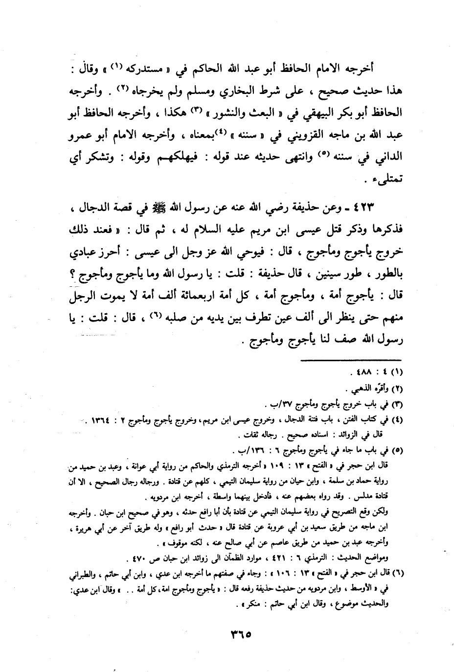وعن حذيفة، رضي الله عنه عن رسول الله صلى الله عليه وسلم في قصة الدجال، فذكرها، وذكر قتل عيسى عليه السلام له، ثم قال: " فعند ذلك خروج يأجوج ومأجوج ".