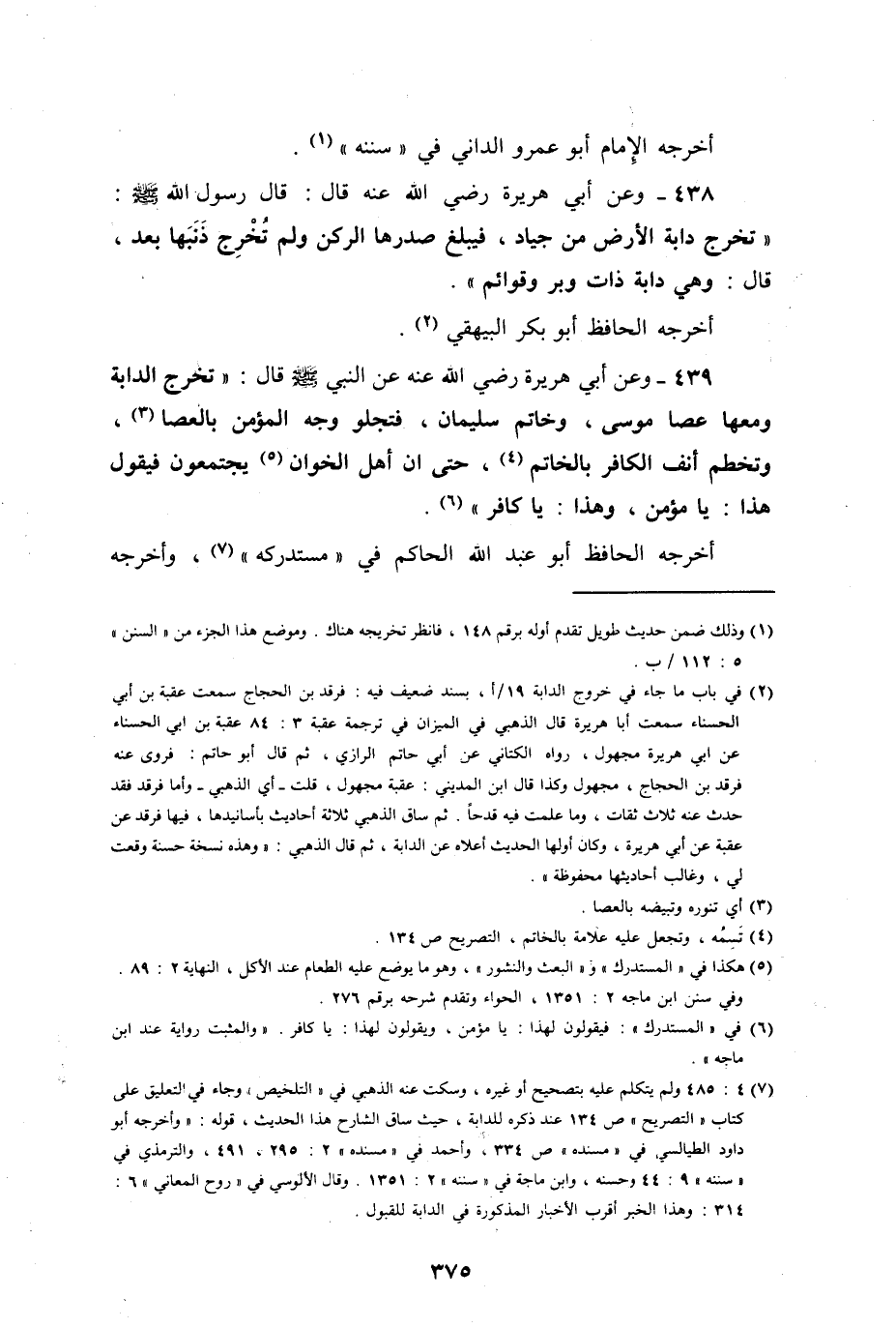 أخرجه أبي هريرة عن النبي صلى الله عليه وسلم قال: " تخرج الدابة ومعها عصى موسى، وخاتم سليمان، فتجلو وجه المؤمن، وتخطم أنف الكافر بالخاتم، حتى إن أهل الخوان يجتمعون، فيقولون لهذا: يا مؤمن: يا كافر ".