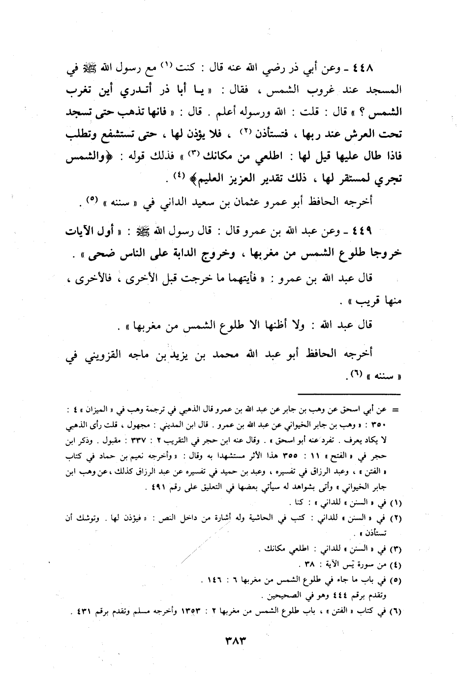 وعن أبي ذر رضي الله عنه قال: كنت مع رسول الله صلى الله عليه وسلم في المسجد، عند غروب الشمس، فقال: " يا أبا ذر، أتدري أين تغرب "؟ قال: قلت: الله ورسوله أعلم.