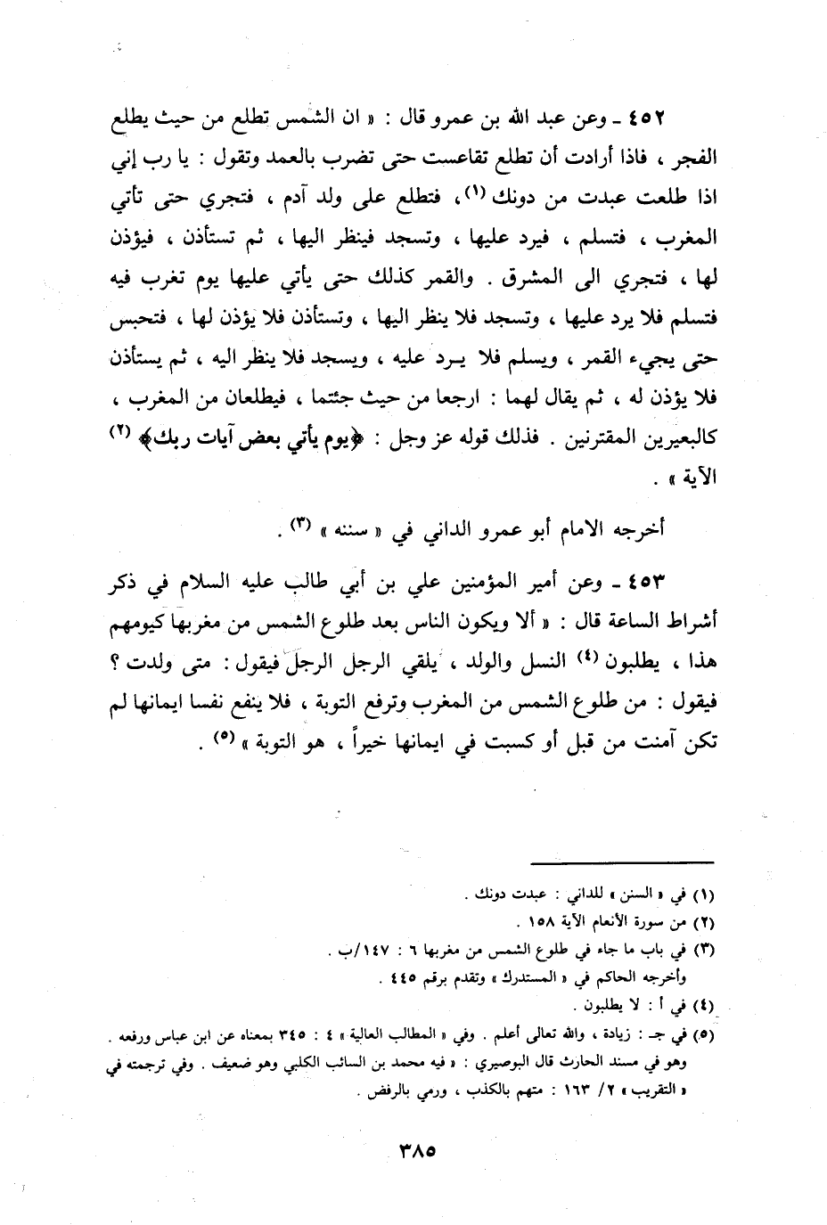وعن عبد الله بن عمرو، قال: إن الشمس تطلع من حيث يطلع الفجر، فإذا أرادت أن تطلع تقاعست حتى تضرب بالعمد، وتقول: يا رب، إذا طلعت عبدت من دونك. فتطلع على ولد آدم فتجري حتى تأتي المغرب فتسلم، فيرد عليها، وتسجد فينظر إليها، ثم تستأذن فيؤذن لها، فتجري إلى المشرق، والقمر كذلك، حتى يأتي عليها يوم تغرب فيه، فتسلم فلا يرد عليها، وتسجد فلا ينظر إليها، وتستأذن فلا يؤذن لها، فتجلس حتى يجيء القمر، فيسلم فلا يرد عليه، ويسجد فلا ينظر إليه، ثم يستأذن فلا يؤذن له، ثم يقال لهما: ارجعا من حيث جئتما. فيطلعان من المغرب كالبعيرين المقترنين، فذلك قوله عز وجل: " يوم يأتي بعض آيات ربك ".