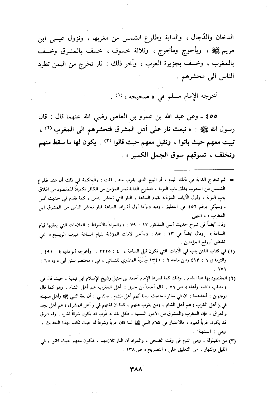 وعن عبد الله بن عمرو بن العاص قال: قال رسول الله صلى الله عليه وسلم: " تبعث نار على أهل المشرق، فتحشرهم إلى المغرب، تبيت معهم حيث باتوا، وتقيل معهم حيث قالوا، تكون لها ما سقط منهم وتخلف، تسوقهم سوق الجمل الكسير ".