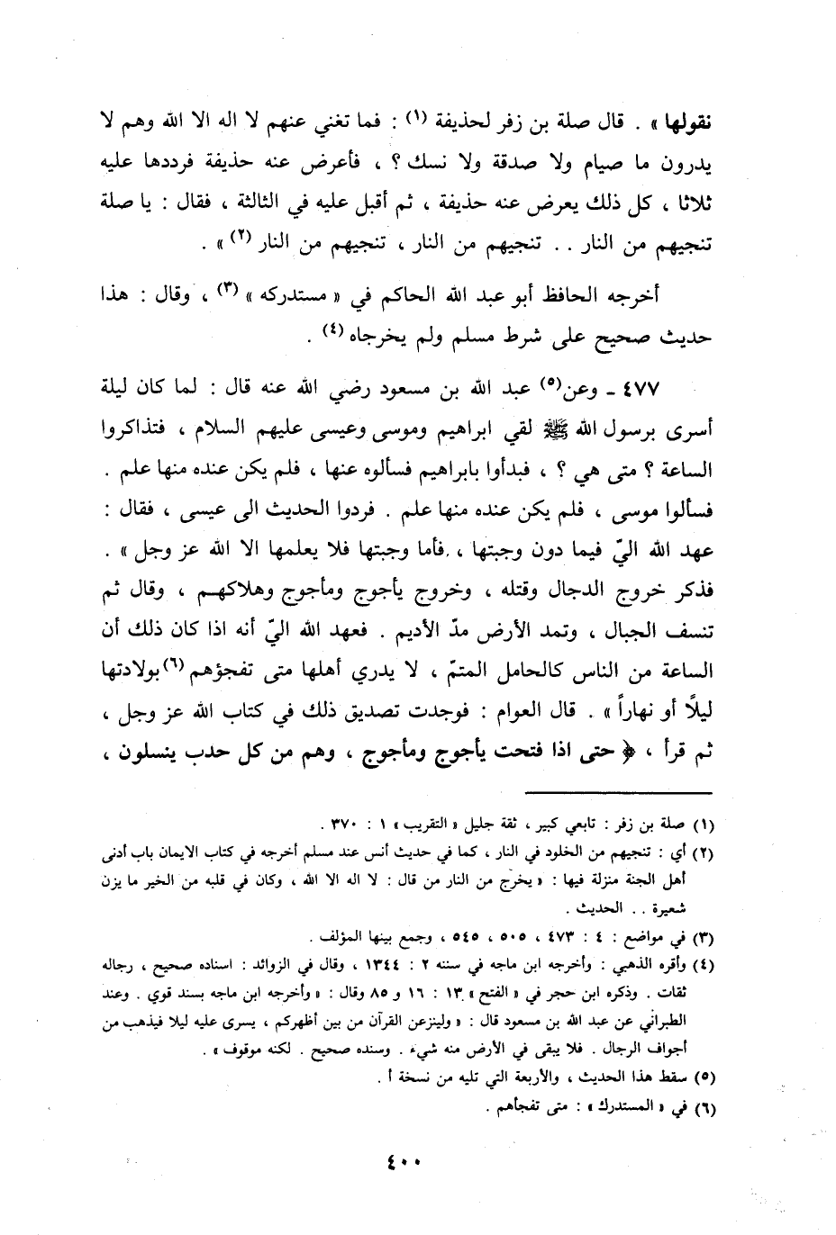 قال صلة بن زفر لحذيفة: فما تغني عنهم لا إله إلا الله، وهم لا يدرون ما صيام ولا صدقة، ولا نسك.؟ فأعرض عنه حذيفة ثم أقبل عليه في الثالثة، فقال: يا صلة، تنجيهم من النار، تنجيهم من النار.