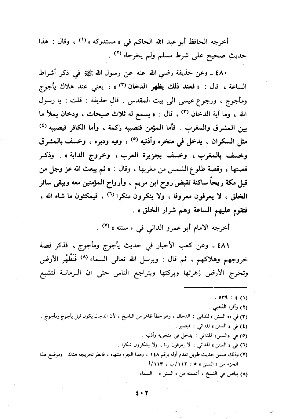 وعن حذيفة رضي الله عنه، عن رسول الله صلى الله عليه وسلم في ذكر أشراط الساعة، قال: " فعند ذلك يظهر الدخان " يني عند هلاك يأجوج ومأجوج، ورجوع عيسى إلى بيت المقدس.