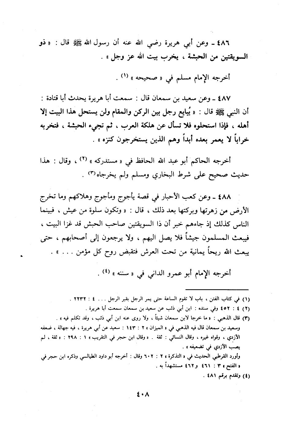 وعن أبي هريرة رضي الله عنه أن رسول الله صلى الله عليه وسلم قال: " ذو السويقتين، من الحبشة يخرب بيت الله ".