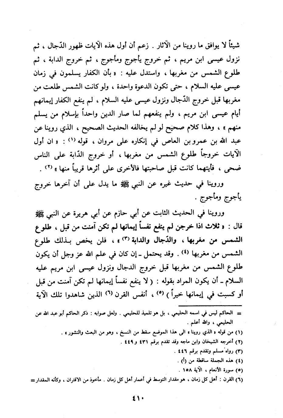 وقد يحتمل إن كان في علم الله عز وجل، أن يكون طلوع الشمس من مغربها، قبل خروج الدجال، ونزول عيسى ابن مريم عليه السلام أن يكون المراد بقوله: " لا ينفع نفساً إيمانها لم تكن آمنت من قبل أو كسبت في إيمانها خيراً " أنفس القرن الذين شاهدوا تلك الآية