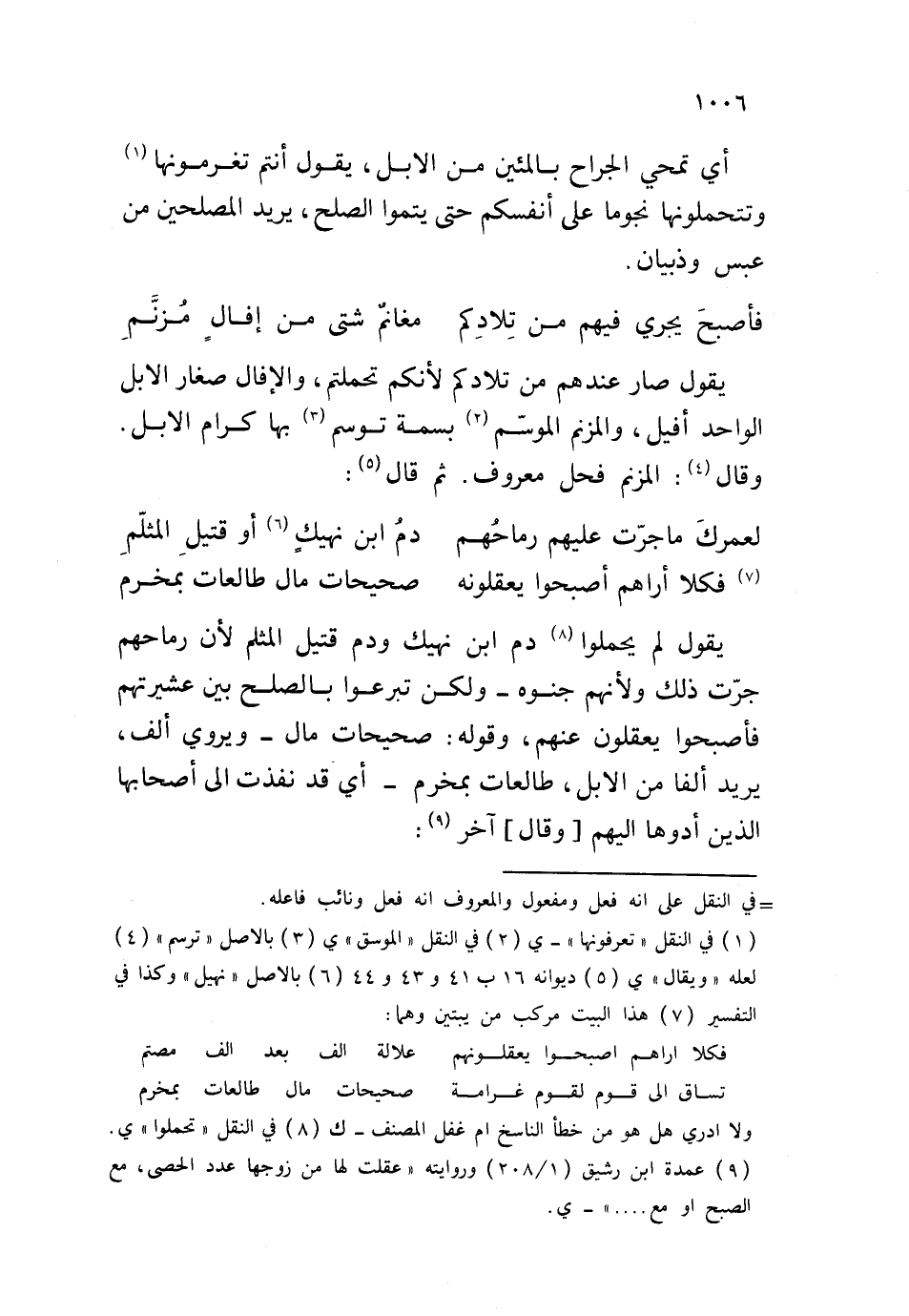 يقول لم يحملوا دم ابن نهيك ودم قتيل المثلم لأن رماحهم جرّت ذلك ولأنهم جنوه - ولكن تبرعوا بالصلح بين عشيرتهم فأصبحوا يعقلون عنهم، وقوله: صحيحات مال - ويروي ألف، يريد ألفا من الإبل، طالعات بمخرم - أي قد نفذت إلى أصحابها الذين أدوها إليهم وقال آخر: