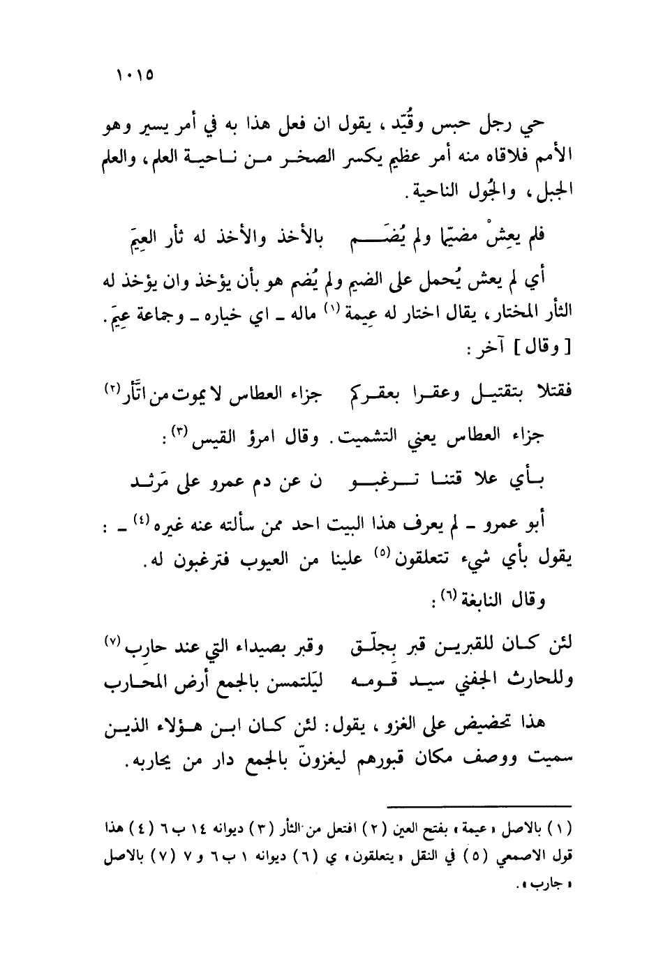 حي رجل حبس وقيّد، يقول إن فعل هذا به في أمر يسير وهو الأمم فلاقاه منه أمر عظيم يكسر الصخر من ناحية العلم، والعلم الجبل، والجول الناحية.