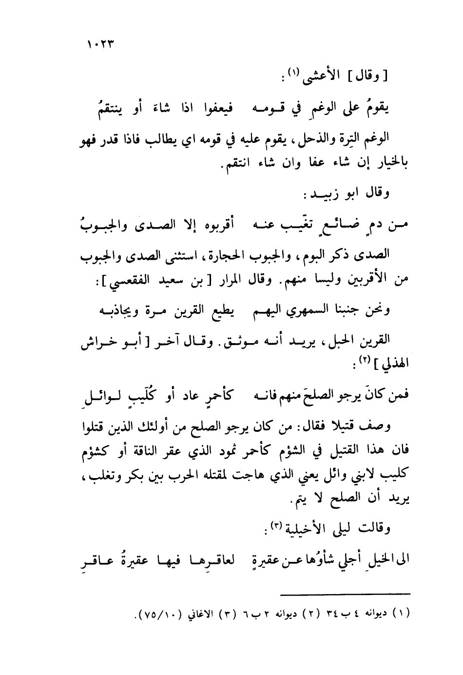 وصف قتيلا فقال: من كان يرجو الصلح من أولئك الذين قتلوا فإن هذا القتيل في الشؤم كأحمر ثمود الذي عقر الناقة أو كشؤم كليب لابني وائل يعني الذي هاجت لمقتله الحرب بين بكر وتغلب، يريد أن الصلح لا يتم. وقالت ليلى الأخيلية: