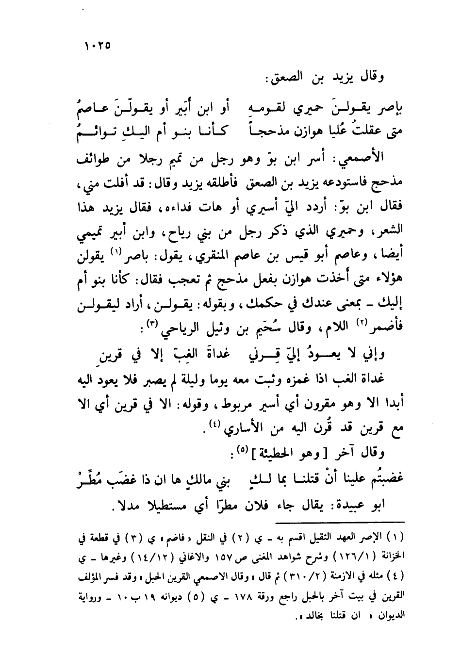 الأصمعي: أسر ابن بوّ وهو رجل من تميم رجلا من طوائف مذحج فاستودعه يزيد بن الصعق فأطلقه يزيد وقال: قد أفلت منيَ، فقال ابن بوّ: أردد إليّ أسيري أو هات فداءه، فقال يزيد هذا الشعر، وحميري الذي ذكر رجل من بني رياح، وابن أبير تميمي أيضا، وعاصم أبو قيس بن عاصم المنقري، يقول: باصر يقولن هؤلاء متى أخذت هوازن بفعل مذحج ثم تعجب فقال: كأنا بنو أم إليك - بمعنى عندك في حكمك، وبقوله: يقولن، أراد ليقولن فأضمر اللام، وقال سُحَيم بن وثيل الرياحي: