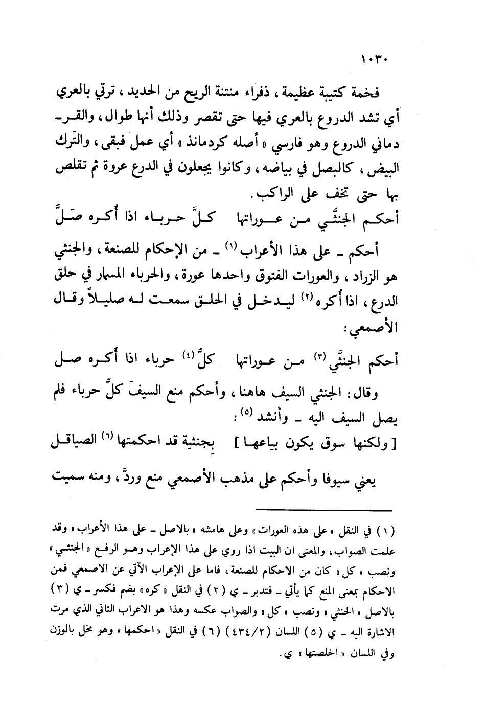 أحكم - على هذا الأعراب - من الإحكام للصنعة، والجنثي هو الزراد، والعورات الفتوق واحدها عورة، والحرباء المسمار في حلق الدرع، إذا أكره ليدخل في الحلق سمعت له صليلاً وقال الأصمعي: