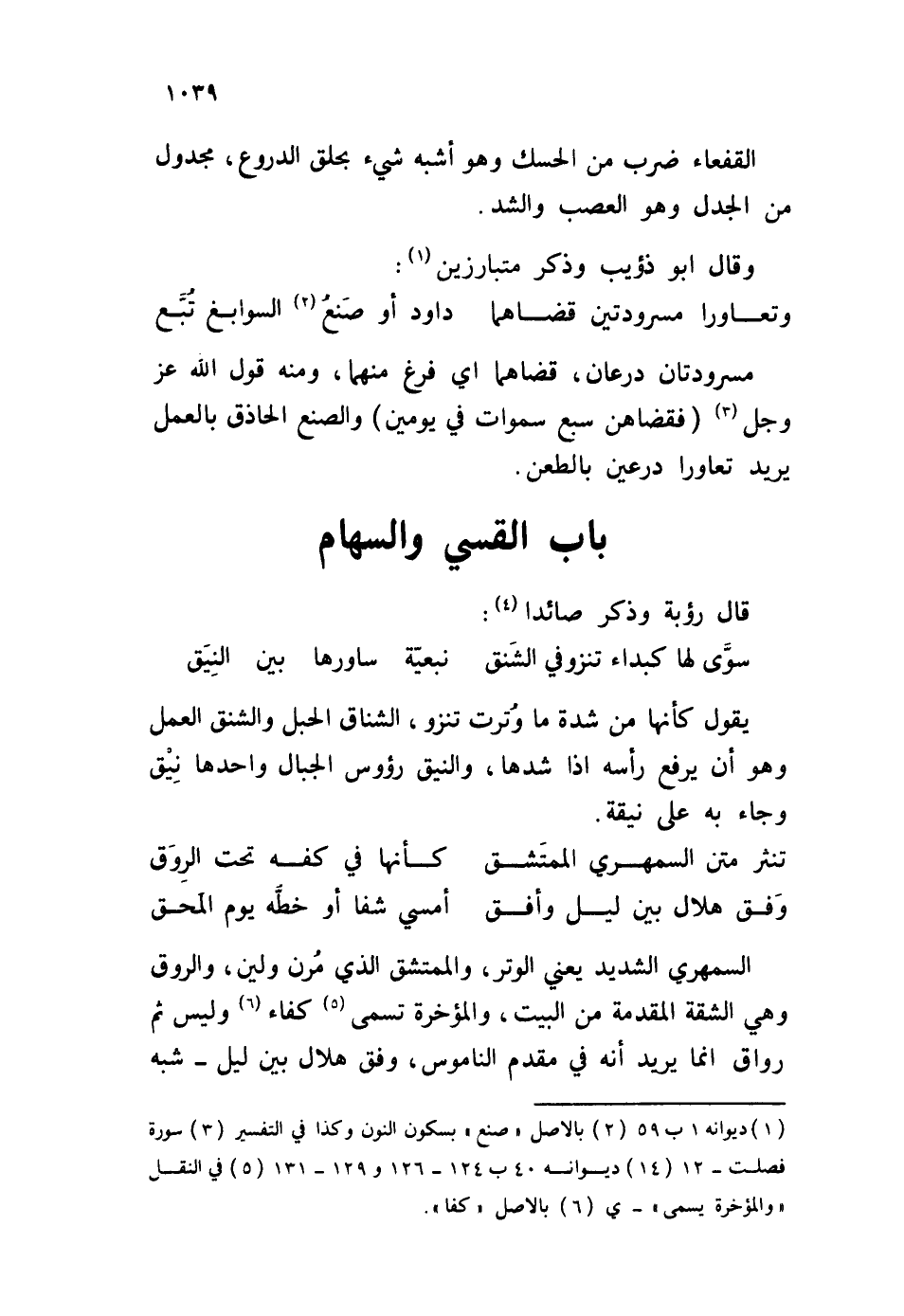 السمهري الشديد يعني الوتر، والممتشق الذي مُرن ولين، والروق وهي الشقة المقدمة من البيت، والمؤخرة تسمى كفاء وليس ثم رواق إنما يريد أنه في مقدم الناموس، وفق هلال بين ليل - شبه