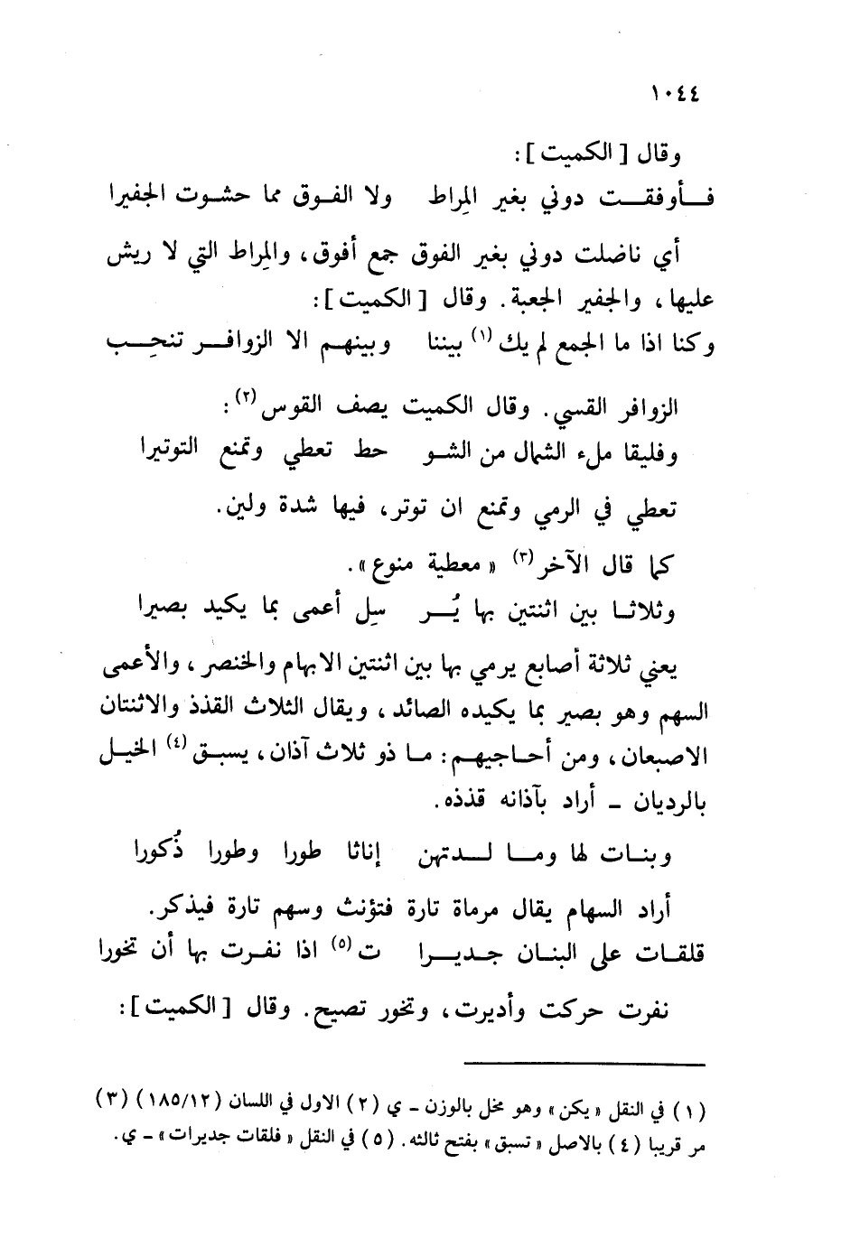 يعني ثلاثة أصابع يرمي بها بين اثنتين الإبهام والخنصر، والأعمى السهم وهو بصير بما يكيده الصائد، ويقال الثلاث القذذ والاثنتان الإصبعان، ومن أحاجيهم: ما ذو ثلاث آذان، يسبق الخيل بالرديان - أراد بآذانه قذذه.
