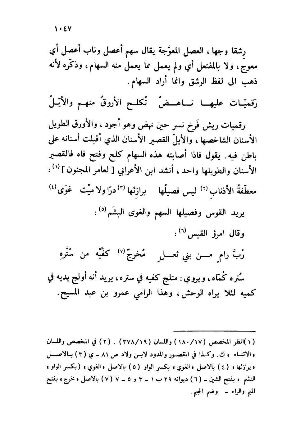 رقميات ريش فَرخ نسر حين نهض وهو أجود، والأورق الطويل الأسنان الشاخصها، والأيلّ القصير الأسنان الذي أقبلت أسنانه على باطن فيه. يقول فإذا أصابته هذه السهام كلح وفتح فاه فالقصير الأسنان والطويلها واحد، أنشد ابن الأعرابي لعامر المجنون: