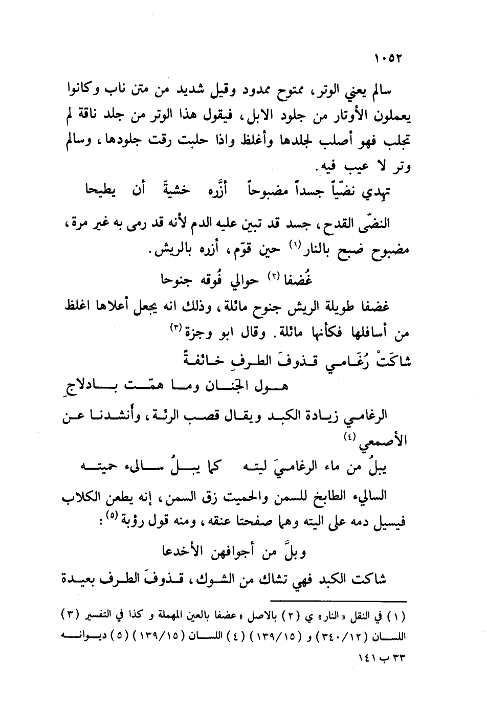 النضّى القدح، جسد قد تبين عليه الدم لأنه قد رمى به غير مرة، مضبوح ضبح بالنار حين قوّم، أزره بالريش.